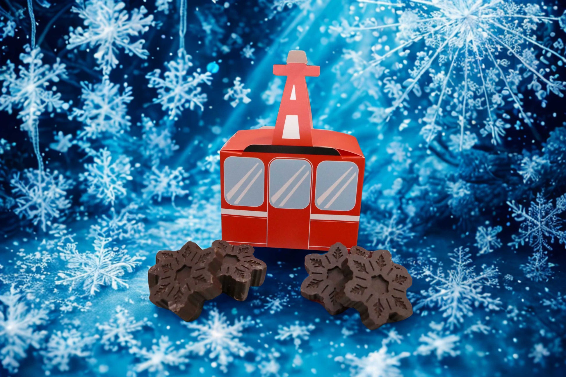 Scatoletta a forma di Funivia contenente 6 fiocchi di neve al cioccolato fondente 65%